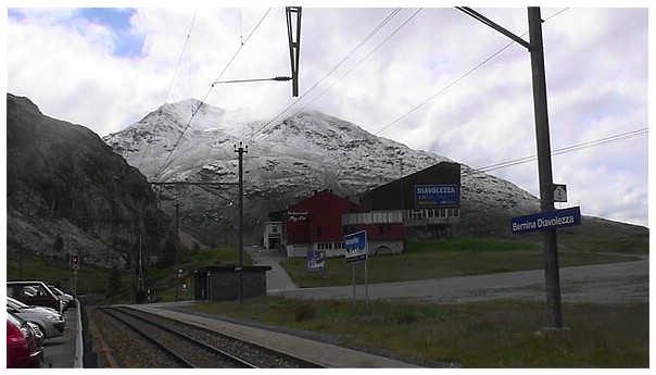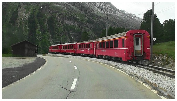 Berninabahn. Sie verbindet St. Moritz in der Schweiz mit Tirano in Italien.