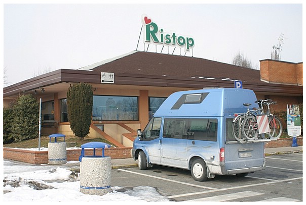 Einige Kilometer vor Mailand an einer Raststätte. Unser Nugget muß leiden.