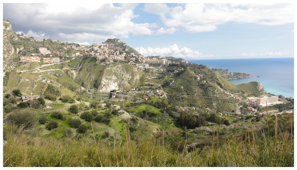 Wir sind oben angekommen. Vor uns liegt Taormina...