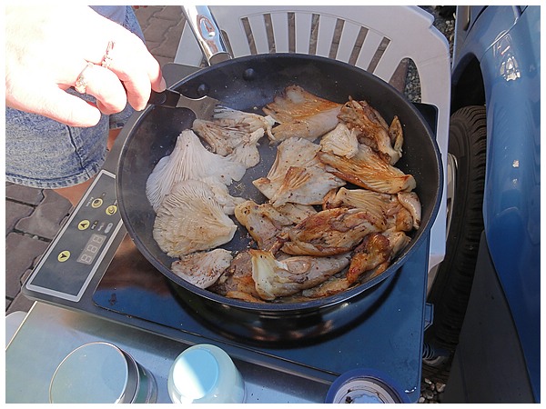 Zum Mittagessen gibt's Austernpilze mit Reis.