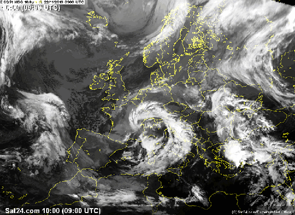 Deutlich ist auf dem Satellitenbild das Tiefdruckgebiet über dem Golf von Genua zu erkennen.