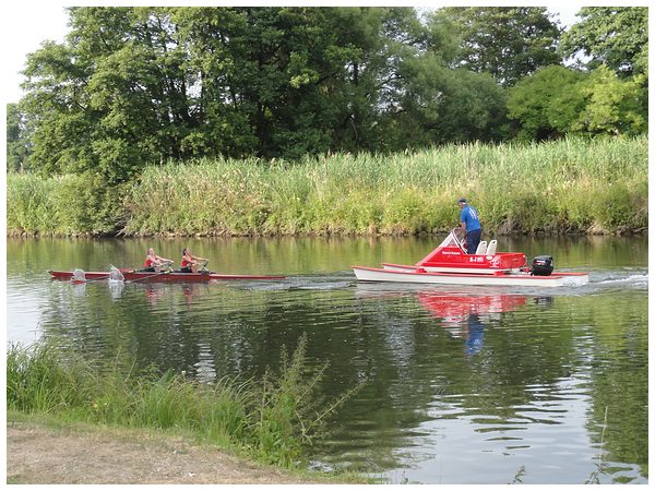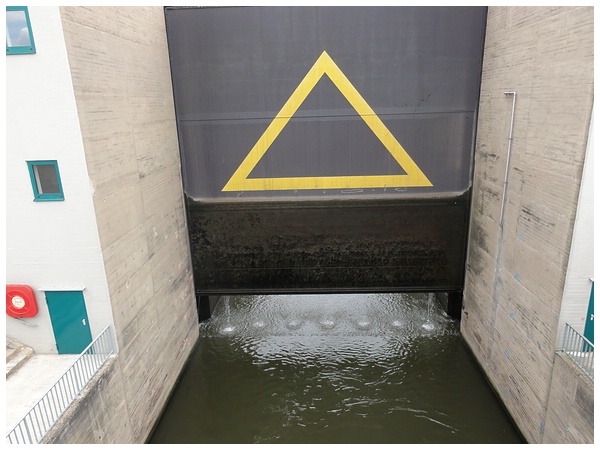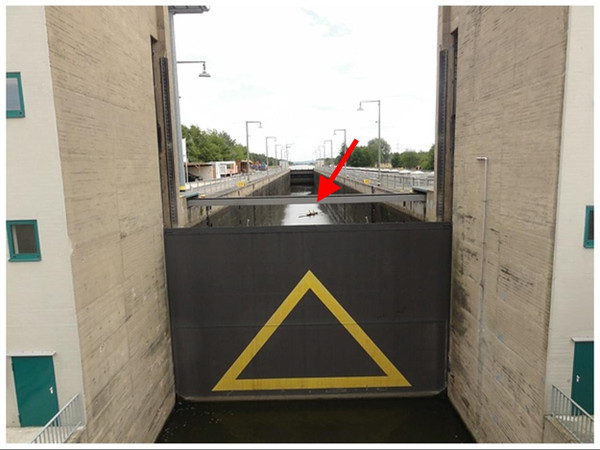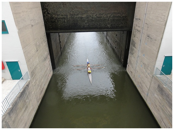 Ein gewaltiges Schleusentor wird nach oben gezogen und läßt einen Renndoppelzweier passieren.