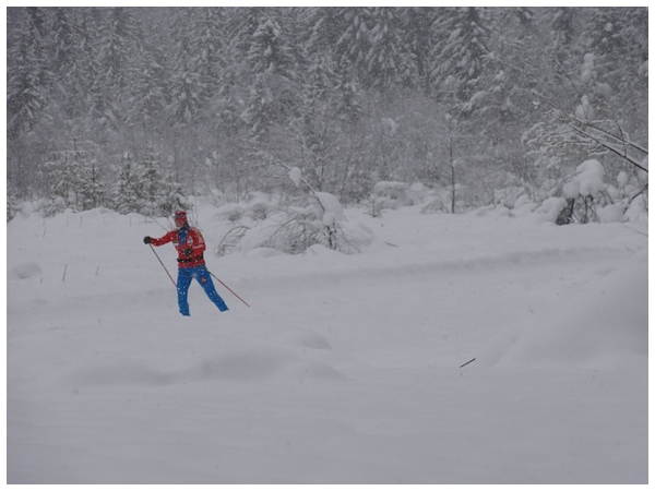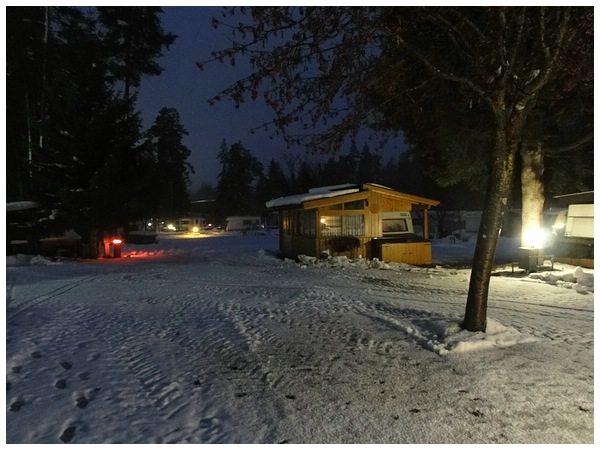 Wir starten zu unserer ersten Langlaufrunde. Der Loipeneinstieg liegt direkt am Campingplatz.