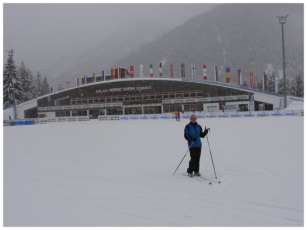 Nach einer halben Stunde erreichen wir die Nordic Arena von Toblach.