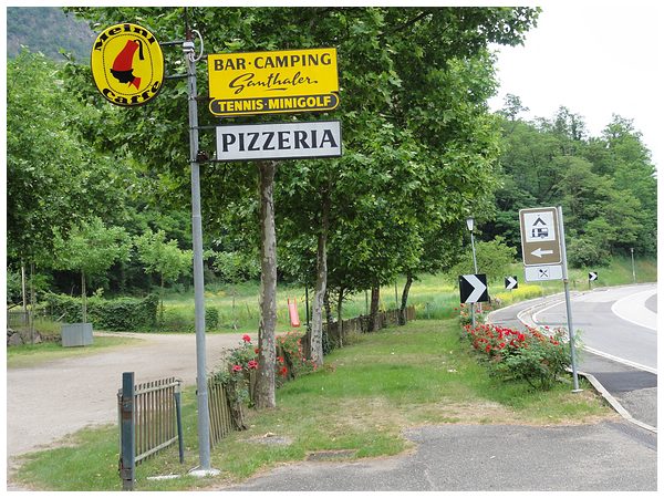 Ein unscheinbares Schild an der Straße von Meran nach Bozen weist auf den Campingplatz Ganthaler hin.