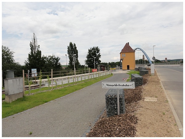 Mainbrücke mit Brückenwärterhaus und stillgelegter Bahnstrecke der Mainschleifenbahn.
