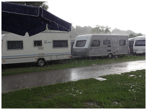 Rechtzeitig, bevor ein kurzer aber heftiger Platzregen einsetzt, erreichen wir den Campingplatz.