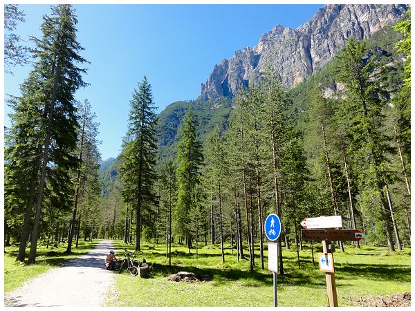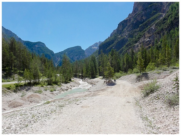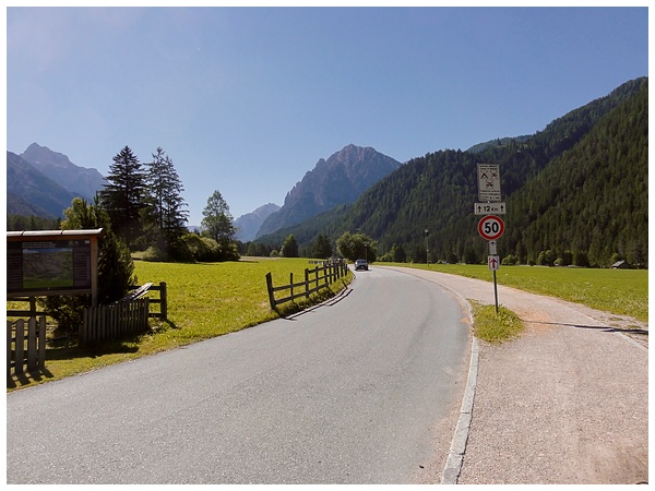 Und hier beginnt auch das Rautal. Auf der verkehrsarmen Straße radeln wir, bei geringer Steigung, in Richtung Pederü-Hütte.