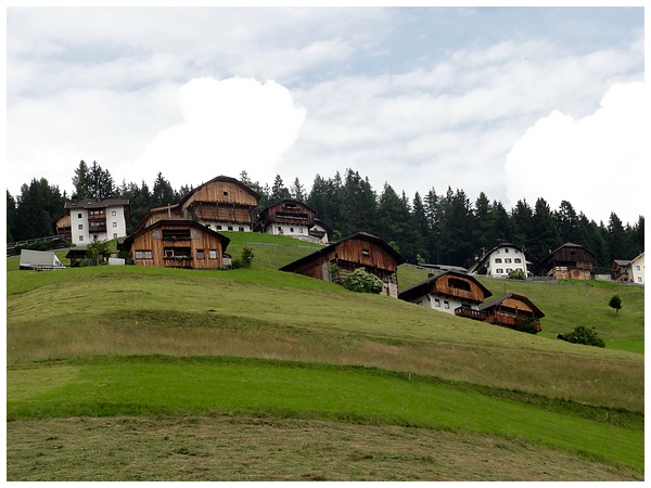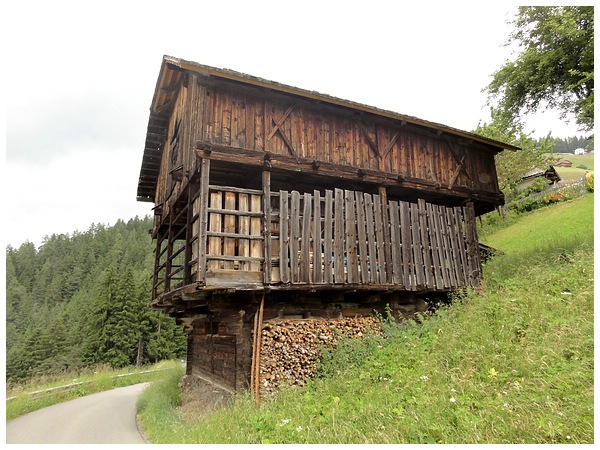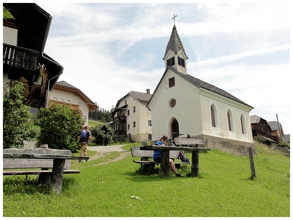 Mittagspause in dem Weiler Gran Ju mit seinen imposanten Bauernhöfen.