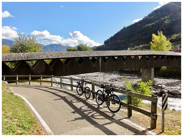 Hier führt der Radweg über eine schöne Holzbrücke an das andere Ufer der Etsch.