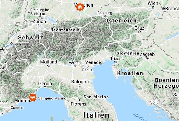 Fahrt durch ein "Stückerl" Österreich und die Schweiz, vorbei an Mailand und Genua, anschließend weiter auf der "Autostrada dei Fiori" entlang der Küste nach Diano Marina.